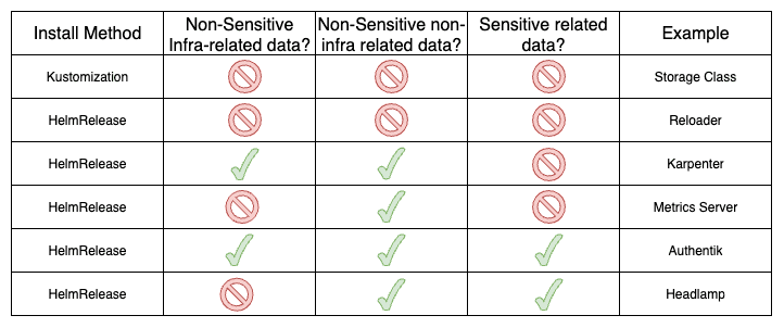 HelmRelease. It needs non-sensitive custom values non-related to infra and sensitive data.