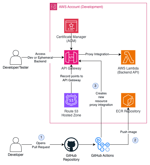 Today, I will cover a strategy for ephemeral environments for backend applications hosted in AWS Lambda behind an API Gateway. So today's goal is to deploy a short-lived environment that exists during the pull request lifecycle, helping the developers and testers make sure the code change implements what is expected, without having to merge to the dev/qa environment to test the changes on a lower environment.
