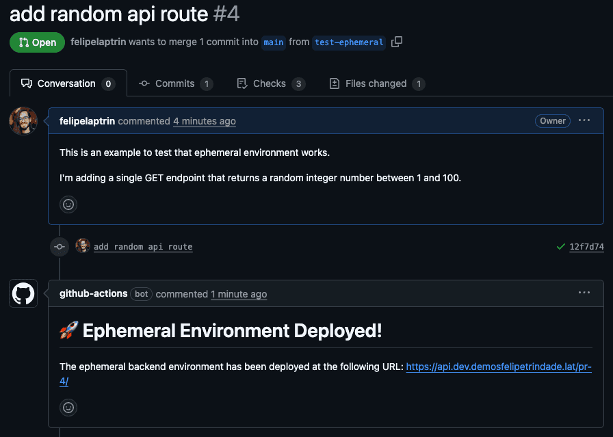 - A comment is added to the pull request with the link to access the ephemeral environment.