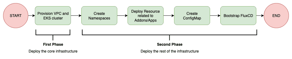 Based on that, first we need to deploy the core infrastructure (usually network related and EKS cluster) before moving to the Kubernetes cluster bootstrap.