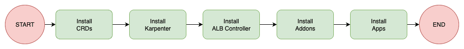 ExternalSecretCR but the CRDs were not installed yet). - Karpenter should be the first addon to be installed in a Kubernetes cluster, since it will guarantee cluster scalability. If you try to deploy Karpenter and several others addons at the same time, it is not guaranteed that the initial nodes of the cluster will have enough memory to install all addons and Karpenter, so it's better to be safe and make sure Karpenter is installed first and can guarantee the cluster scalability.