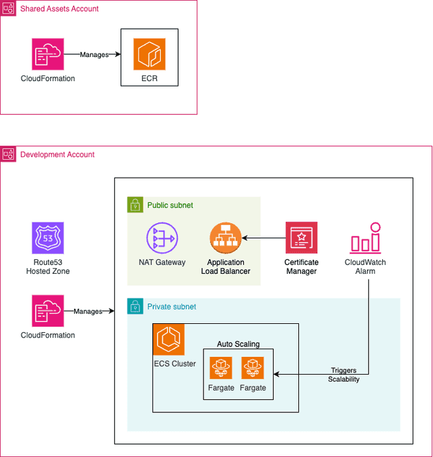 EcrStack: Created ECR repository that will contain the API image. Should be deployed in the Shared Assets account.EcsStack: Create the entire ECS infrastructure, VPC, Certificates, Route53 record... Should be deployed in the Development account.
