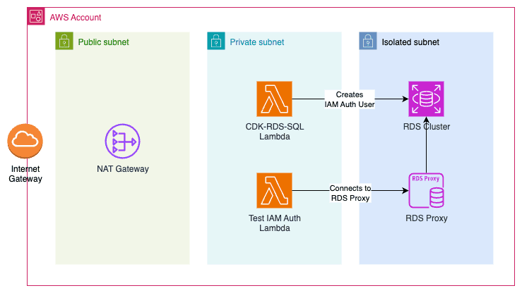 - VPC with public (for the NAT Gateway), private (for CDK-RDS-SQL module), and isolated (for RDS Cluster and RDS Proxy)